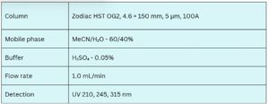 Bromhexine, a mucolytic, and Ambroxol, an expectorant, are commonly used to manage respiratory conditions involving excess mucus. These agents can be effectively retained, separated, and analyzed using a Zodiac HST OG2 mixed-mode column under isocratic conditions with a mobile phase of water, acetonitrile (MeCN), and sulfuric acid (H₂SO₄) as the ionic modifier. Detection is performed in the low UV range at 210 nm, 245 nm, and 315 nm, ensuring reliable quantification in pharmaceutical formulations.