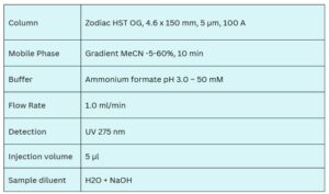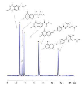 These five pterin derivatives can be efficiently retained, separated, and analyzed using the Zodiac HST OG mixed-mode reversed-phase column (4.6 × 150 mm, 5 µm, 100 Å). The method employs a mobile phase comprising water, acetonitrile (MeCN), and ammonium formate as a buffer, making it fully compatible with UV detection at 275 nm, ELSD, Charged Aerosol Detection (CAD), or Electrospray Ionization Mass Spectrometry (ESI-MS).