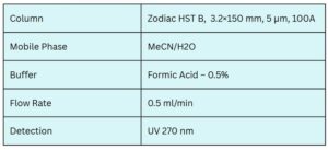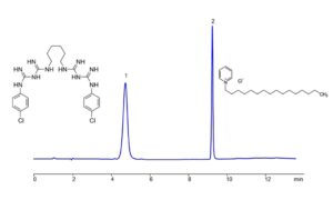 Both chlorhexidine and cetylpyridinium chloride, being cationic compounds, can be effectively separated and analyzed using HPLC on Zodiac HST B reverse-phase mixed-mode column. The analysis utilizes a mobile phase composed of acetonitrile (ACN), water, and formic acid buffer. Detection is performed via UV absorbance at 270 nm, providing clear resolution of both analytes.