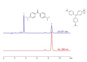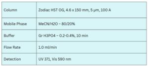 Michler’s ketone and Crystal Violet can be separated, retained, and analyzed on a Zodiac HST OG mixed-mode stationary phase column using an isocratic mobile phase of water, acetonitrile (MeCN), and sulfuric acid (H₂SO₄) as a buffer. Detection is performed in the UV-Vis range at 540, 590, and 200 nm.