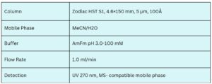 Both Pyridoxine and Doxylamine can be efficiently retained, separated, and analyzed using the Zodiac HST S1 normal-phase mixed-mode column. The isocratic HPLC method utilizes a mobile phase consisting of water, acetonitrile (MeCN), and ammonium formate buffer. Detection is performed in the low UV range at 270 nm, ensuring reliable quantitation of both compounds.