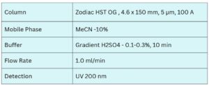 These compounds are separated and analyzed on a Zodiac HST OG reverse-phase column (4.6 × 150 mm, 5 µm, 100 Å) using a water/MeCN/sulfuric acid mobile phase.