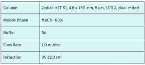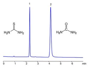 Both urea and thiourea can be effectively retained, separated, and analyzed using a Zodiac HST S1 normal-phase mixed-mode column. The method employs a mobile phase of water and acetonitrile (MeCN) without buffer and allows for UV detection at 200 nm.
