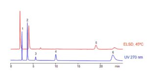 Separation of B-group vitamins is accomplished using the Zodiac HST N column operating in mixed-mode HILIC. These vitamins vary significantly in polarity and ionic characteristics, making their separation challenging using conventional techniques. Retention and resolution are finely tuned through optimization of acetonitrile content, buffer strength, and buffer pH. A combination of UV and ELSD detection is employed to monitor the separation effectively.