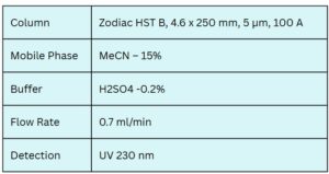 Labetalol and its stereoisomers can be effectively retained, separated, and analyzed using the Zodiac HST B mixed-mode stationary phase column. The method utilizes an isocratic mobile phase consisting of water, acetonitrile (MeCN), and sulfuric acid as the buffering system. Detection is performed using UV at 230 nm, making the method suitable for routine pharmaceutical analysis.