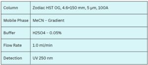These five structurally related organic compounds were successfully separated and analyzed using the Zodiac HST OG mixed-mode column. The method employs a simple gradient mobile phase composed of water, acetonitrile (MeCN), and sulfuric acid (H₂SO₄) as the buffer. The separation is monitored by UV detection at 250 nm, offering high resolution and excellent peak symmetry.