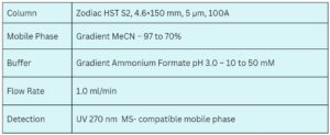 Acetaminophen (paracetamol), a widely used pain reliever, ascorbic acid (Vitamin C), essential for tissue repair and enzymatic function, and phenylephrine, a common decongestant, can all be effectively separated using the Zodiac HST S2 column. This normal-phase HILIC method employs a mobile phase of water and acetonitrile (MeCN) with ammonium acetate buffer. The compounds are monitored by UV detection at 270 nm. Buffer concentration adjustment allows fine-tuning of retention and even reversal of elution order between phenylephrine and ascorbic acid. The method is compatible with mass spectrometry and suitable for pharmaceutical and clinical analysis.