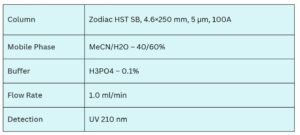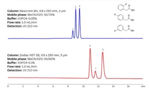 All 3 isomers can be measured at low UV. Using a Zodiac HST SB reverse-phase columns and a mobile phase consisting of acetonitrile (MeCN) and water with either formic acid or acetic acid buffer, these fluorophenylacetic acid isomers can be retained, separated, and UV detected at 210nm with precise resolution.