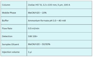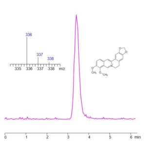 Berberine can be retained and analyzed using a Zodiac HST B mixed-mode column with an isocratic mobile phase of water, acetonitrile (MeCN), and ammonium formate buffer. Detection is performed using LC-MS at m/z 336 (positive mode).
