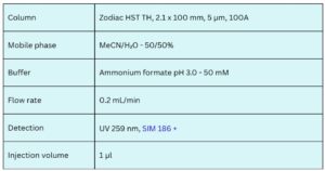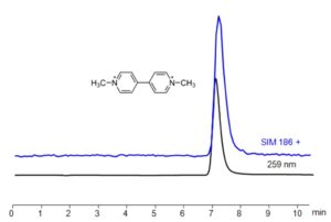 Paraquat can be efficiently retained and analyzed using the Zodiac HST TH mixed-mode stationary phase column. The method employs an isocratic elution technique with a straightforward mobile phase composed of water, acetonitrile (MeCN), and ammonium formate as a buffer. Detection is carried out using Evaporative Light Scattering Detection (ELSD), or alternatively, other evaporative-based detection methods such as Charged Aerosol Detection (CAD) or Electrospray Ionization Mass Spectrometry (ESI-MS).