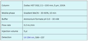 Procainamide can be effectively retained and analyzed using a Zodiac HST OG2 mixed-mode stationary phase column. The analysis is performed using a gradient elution method with a mobile phase consisting of water, acetonitrile (MeCN), and ammonium formate as a buffer. Detection is carried out using UV at 280 nm.
