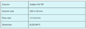 N-Cyclohexylsulfamic acid (cyclamic acid), commonly found as its sodium or calcium salt, is an artificial sweetener and a hydrophilic, strongly acidic compound. It was successfully analyzed using the Zodiac HST RP mixed-mode HPLC column with a mobile phase consisting of acetonitrile, water, and ammonium formate buffer. Since cyclamic acid lacks UV chromophores, it was detected using ELSD, and is also compatible with Corona or LC/MS detection techniques.