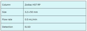 The Zodiac HST RP mixed-mode column enables efficient separation of all polysorbate oligomers. One well-resolved oligomer can be selected as a quantitative marker, allowing reliable measurement of total polysorbate content in pharmaceutical and food formulations. This method provides a robust and reproducible solution for monitoring polysorbate levels across diverse product types.