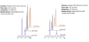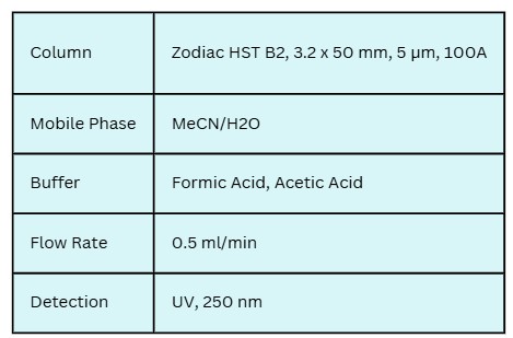 Zodiac HST B2 columns enable the separation of Vitamins C (ascorbic acid) and B2 (riboflavin) with adjustable selectivity. Peak order can be reversed by modifying the acetonitrile concentration, with Vitamin B2 being particularly sensitive to these changes. The method uses a mobile phase of water, acetonitrile (MeCN), and trifluoroacetic acid (TFA) or acetic acid (HOAc) with UV detection at 250 nm.