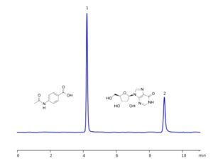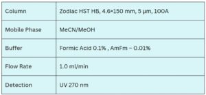 Due to the high polarity of both components, traditional chromatographic retention is challenging. However, both compounds can be effectively retained and separated under anhydrous (water-free) conditions using a Zodiac HST HB column, which operates on hydrogen-bonding interaction. The method utilizes a gradient elution with acetonitrile (ACN) and methanol (MeOH) and includes a volatile buffer system (0.1% formic acid and 0.01% ammonium formate), making the method fully LC/MS-compatible. Detection is typically performed at 270 nm using UV, though LC/MS can also be employed for greater sensitivity.