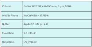Separating basic, acidic, and zwitterionic compounds in a single reverse-phase HPLC run is often challenging, requiring complex gradients and ion-pairing reagents that may hinder MS compatibility. The Zodiac HST TH column, featuring embedded positive and negative ion-pairs, enables precise tuning for the separation of a wide range of compounds with varying ionic properties. Acids, bases, amino acids, and neutral compounds can be separated isocratically using a simple MS-compatible mobile phase of acetonitrile (ACN), water, and ammonium acetate (AmAc) buffer, with detection possible at 250 nm.