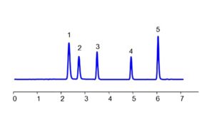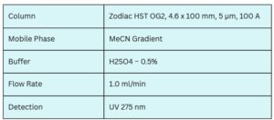 Antibiotics, especially those containing sulfanilamide structures, are commonly used to combat bacterial infections. These compounds can be effectively separated using Zodiac HST OG2, a mixed-mode column with weak acidic ion-pairing groups. Using a gradient mobile phase of acetonitrile (ACN) or methanol (MeOH), water, and sulfuric acid (H₂SO₄) buffer, the antibiotics show good resolution with UV detection at 275 nm.