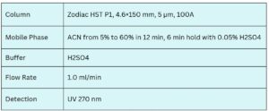 The Zodiac HST P1 column contains an aromatic functionality that enables π-π interactions, enhancing selectivity for aromatic compounds. Detection can be performed using UV, ELSD, CAD, or LC/MS, and a variety of mobile phases can be used depending on analytical needs. This method provides flexibility and sensitivity for boronic acid analysis.