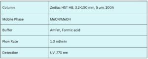 Xanthines are polar, neutral compounds that are difficult to retain and separate using conventional reversed-phase chromatography. However, the Zodiac HST HB column enables their effective separation through hydrogen-bonding interactions.