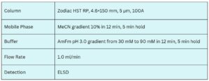 The citric acid cycle (also known as the tricarboxylic acid cycle or Krebs cycle) is a central metabolic pathway through which aerobic organisms produce energy. The intermediates generated during this cycle are hydrophilic, acidic compounds, varying in acid strength from strong to moderately weak. Due to their low hydrophobicity, these compounds are not effectively retained on conventional reversed-phase columns such as C18 or C8. Using the Zodiac HST RP mixed-mode column, citric acid and related metabolites are successfully separated through a combination of reversed-phase and anion-exchange mechanisms. The method delivers strong retention, good peak shape, and robust separation of all hydrophilic acidic components. It is fully compatible with LC/MS detection and preparative chromatography, making it suitable for comprehensive analysis of TCA cycle intermediates and other polar acidic molecules.
