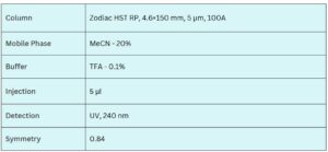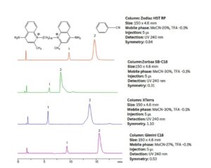 This method is particularly suitable for analyzing and quantifying hydrophobic amines, especially when conventional RP columns fail to deliver acceptable peak shapes. A comparative evaluation with several modern LC columns—such as Zorbax (Agilent), XTerra (Waters), and Gemini (Phenomenex)—demonstrates that the Zodiac HST RP column performs reliably for the separation of hydrophobic quaternary amines and diamines.