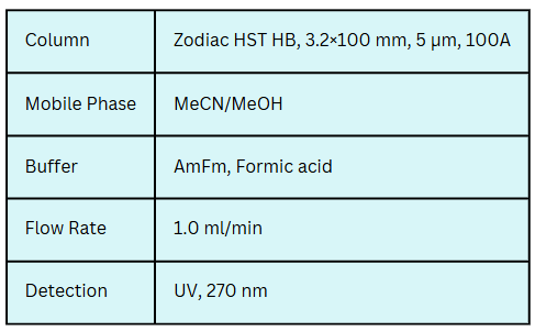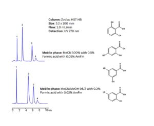 Dihydroxybenzoic acids, polar acidic compounds with hydroxyl and carboxylic acid groups, are ideal candidates for separation using the Zodiac HST HB column via hydrogen-bonding mechanisms. Isomers are separated based on the accessibility of their hydroxyl groups. Retention times can be adjusted by varying acetonitrile (ACN), methanol (MeOH), and additive concentrations (formic acid, ammonium formate, triethylamine, etc.). This method is fully compatible with LC/MS and preparative chromatography and can be applied to other hydroxyl- and carboxylic acid-containing compounds.