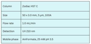 The Zodiac HST C column offers shorter retention times, enabling separation of both compounds in under 5 minutes. Unlike traditional methods, Zodiac HST C and Zodiac HST OG2 columns do not require external ion-pairing reagents, as the ion-pairing functionality is integrated into the surface chemistry of the Zodiac silica gel.