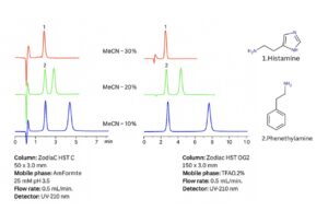 Histamine is a basic compound that functions as a neurotransmitter, while phenethylamine is a naturally occurring amine alkaloid with psychoactive and stimulant properties. It is produced through the enzymatic decarboxylation of phenylalanine and also acts as a neurotransmitter. Both histamine and phenethylamine can be efficiently separated in a single HPLC run using Zodiac HST C and Zodiac HST OG2 columns, which utilize a reversed-phase cation-exchange mechanism.