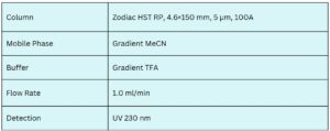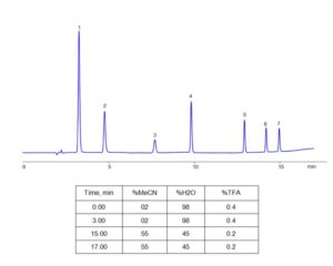 Iodine is crucial for thyroid hormone production, with T3 and T4 playing key roles in metabolism regulation. This HPLC method enables simultaneous analysis of iodide, T3, T4, and their precursors (3,5-Diiodo-L-thyronine, 3,5-Diiodo-L-tyrosine, and 3-Iodo-L-tyrosine). The Zodiac HST RP column, combining hydrophobic and anion-exchange properties, is used to analyze these hydrophobic hormones and the polar iodide ion. The method utilizes TFA as an ionic modifier for stable acidic pH and sufficient ion strength, with mobile phase conditions compatible with UV, MS, ELSD, and CAD detection.