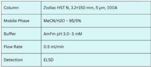 Maleic acid is a small, hydrophilic acid that exhibits poor retention in traditional reversed-phase chromatography. Pentaerythritol is a neutral hydrophilic compound. A mixed-mode HILIC/anion-exchange method was developed using the Zodiac HST N HPLC column. Retention of maleic acid is influenced by the acetonitrile content, buffer pH, and buffer concentration, while the retention of pentaerythritol is primarily controlled by the acetonitrile level. The method is fully compatible with both LC/MS and ELSD/CAD detection.
