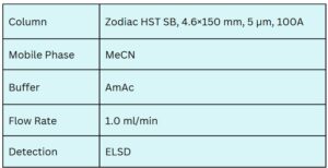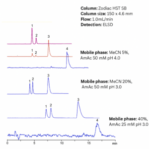 Alkylphosphonic acids are degradation byproducts of chemical warfare agents, and their analysis in water is regulated by the Environmental Protection Agency (EPA). These compounds are highly polar and acidic in nature. A method for the retention and separation of methylphosphonic, ethylphosphonic, ethyl methylphosphonic, and isopropyl methylphosphonic acids was developed using a ZodiaA HST SB reversed-phase anion-exchange column. The method is fully compatible with LC/MS detection and is suitable for the quantification of phosphonic acids in water samples.