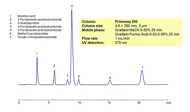 Column Name : Primesep 200 ColumnsCompound Name : Nicotinic Acid, 2-Pyridylacetic acid hydrochloride, 4-Pyridylacetic acid hydrochloride, 3-Pyridylacetic acid hydrochloride, Pyridyl-3-thioacetomorpholide,3-Acetylpyridine, Methyl-2-pyridylacetateGet in Touch!! I agree that my submitted data is being collected and stored.Get Your Quote or Call: 040-29881474We focus on supporting laboratory workflows & optimizing lab-wide operationsContact us