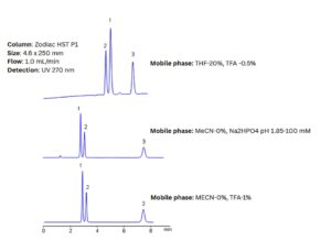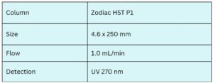 Dopamine, norphenylephrine and serotonin are separated on Zodiac HST P1 HPLC column. Base line separation of these neurotransmitters can be achieved using mix-mode approach. Zodiac HST P1 provides retention by reverse phase, pi-pi and cation-exchange mechanisms. Method can be used for fast quantitation of these compounds in various sample matrices. Detection technique ranges from UV to ELSD, LC/MS, RI and CAD.Zodiac HST P1 column can be used with tetrahydrofuran or with 100% aqueous mobile phase to enhance pi-pi interaction.