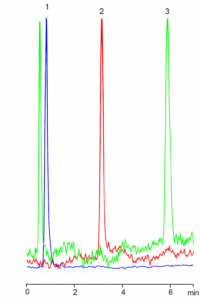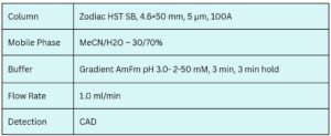 Glucuronic acid, methanesulfonic acid, and butanesulfonic acid—three organic acids—were successfully separated using the Zodiac HST SB mixed-mode column. This column features a reversed-phase stationary phase with embedded basic ion-pairing groups, enabling effective retention and separation of highly polar acidic compounds through a combination of reversed-phase and ion-exchange mechanisms.