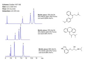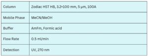 Using the Zodiac HST HB column, separation is achieved through hydrogen bonding between analytes and the stationary phase. This mechanism provides unique selectivity, excellent peak shape, and precise retention control.
