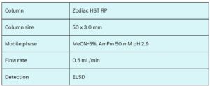 Organic and inorganic acids can be effectively separated using the Zodiac HST RP reversed-phase anion-exchange column. Compounds such as succinic acid and methylmalonic acid were resolved based on differences in both their hydrophobic and ionic characteristics. This method offers a reliable approach for the HPLC analysis of a wide range of acidic compounds, making it suitable for various applications in pharmaceutical, biochemical, and environmental research.
