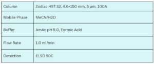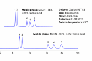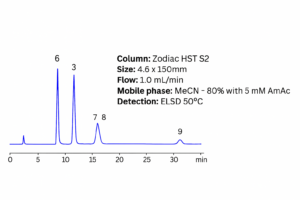 Five sugars were effectively separated on the Zodiac HST S2 column under LC/MS-compatible HILIC conditions. Different mobile phase compositions provided varying selectivity and resolution, allowing flexibility based on application needs. This method serves as a reliable alternative to aminopropyl columns, with the added advantage of greater stability—the Zodiac HST S2 does not undergo rapid hydrolysis, ensuring consistent performance over time.