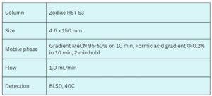Sulfate ions and sulfamic acid, both highly hydrophilic and UV-inactive, are separated in HILIC mode on the Zodiac HST S3 column. Retention is achieved through hydrophilic interaction, and detection is performed using ELSD. This method is also applicable for the analysis of other inorganic ions.