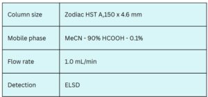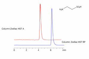 Taurine (2-aminoethanesulfonic acid) is an organic zwitterionic compound. As a non-essential, sulfur-containing amino acid, taurine functions alongside glycine and gamma-aminobutyric acid as a neurotransmitter. It is also incorporated into chenodeoxycholic acid, one of the most abundant bile acids, where it aids in emulsifying dietary lipids in the intestine to promote digestion. Taurine is widely used in food and pharmaceutical formulations. However, its high polarity and zwitterionic nature complicate its analysis by traditional reversed-phase chromatography. Two methods have been developed for the analysis of taurine using mixed-mode columns: retention on the Zodiac HST A column occurs through a HILIC cation-exchange mechanism, while retention on the Zodiac HST RP column occurs through a HILIC anion-exchange mechanism. These methods enable fast and effective quantitation of taurine in various products, including energy drinks. Due to taurine’s lack of UV absorbance, detection by ELSD or LC/MS is required.