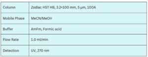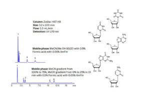Using the Zodiac HST HB column, which operates via hydrogen-bonding interactions, effective separation of nucleosides such as thymidine, uridine, adenosine, guanosine, and cytidine was achieved. The retention time shows a strong dependence on the mobile phase composition, particularly the ratio of acetonitrile (ACN) to methanol (MeOH).