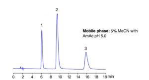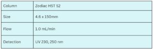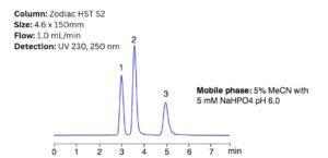 Isomers of toluidine were successfully retained and separated in cation-exchange mode using the Zodiac HST S2 column. This column supports HILIC, cation-exchange, and anion-exclusion mechanisms, making it versatile for separating polar compounds. The method is fully compatible with UV, ELSD, and LC/MS detection, and is suitable for routine analysis of isomeric and polar molecules.