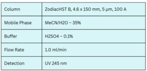 Prednisone can be effectively retained and analyzed using a Zodiac HST B mixed-mode stationary phase column. The method utilizes an isocratic mobile phase composed of water, acetonitrile (MeCN), and sulfuric acid as a buffer. Detection is achieved using UV at 245 nm, providing reliable results for quantitative analysis.