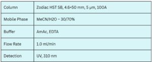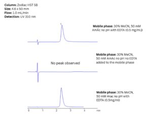 A novel method for analyzing copper ions in high-salt matrices was developed using EDTA as a visualization agent. Copper ions form UV-detectable colored complexes with EDTA, allowing for selective detection, while other cations that do not form colored complexes pass through the column undetected. This selective analysis was performed using the Zodiac HST SB mixed-mode column. The method enables sensitive detection of copper ions at parts-per-million (ppm) levels, even in complex sample matrices.