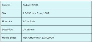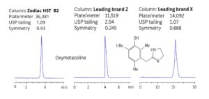 The Zodiac HST B2 column delivers superior efficiency, symmetry, and peak shape for hydrophilic basic compounds compared to leading C18 columns. Its embedded basic functional group prevents interactions with silica, eliminating tailing caused by exposed silanols on reversed-phase columns. The method uses a simple mobile phase of water, acetonitrile (MeCN), and trifluoracetic acid (TFA) with UV detection at 250 nm.