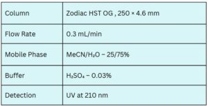 Organic acids were separated by ion-exclusion chromatography using the Zodiac HST OG column (250 × 4.6 mm). The mobile phase consisted of 25% acetonitrile and 75% water with 0.03% sulfuric acid. The method was run at a flow rate of 0.3 mL/min and monitored by UV detection at 210 nm.