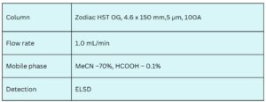 By leveraging both reversed-phase and ion-exchange properties, the Zodiac HST OG column offers excellent retention and resolution of long-chain fatty acids under high organic solvent conditions.
