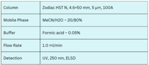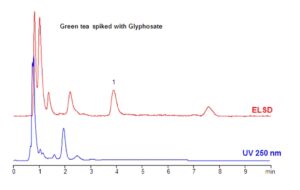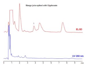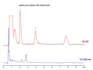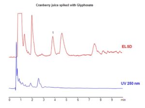 Glyphosate is a widely used broad-spectrum herbicide, and its presence in food and water is strictly regulated by authorities across the US, Europe, and Asia. A method was developed for the analysis of glyphosate in fruit juices and teas using the Zodiac HST N column, which operates through a combination of HILIC and ion-exchange mechanisms. Glyphosate is effectively retained via ion exchange. Uniquely, the method employs a highly aqueous mobile phase—uncommon for typical HILIC applications—which prevents interference from sugars, vitamins, and other matrix components in juice samples. Juices spiked with glyphosate were analyzed, and this method can be coupled with LC/MS for highly sensitive detection of glyphosate in a variety of samples, including fruits, vegetables, and both ground and drinking water.