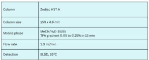 Ammonia, primary, and secondary amines are essential building blocks in organic synthesis and are widely used in agriculture, pharmaceuticals, and chemical manufacturing. These basic, hydrophilic compounds often present analytical challenges, including poor peak shape, limited retention on C18 columns, and lack of UV chromophores. The Zodiac HST A mixed-mode column provides effective retention and separation without the need for derivatization or ion-pairing reagents. Using a mobile phase with trifluoroacetic acid, compounds such as ammonia, methylamine, morpholine, ethylamine, diethylamine, and butylamine can be efficiently analyzed and monitored by ELSD, ensuring reliable peak shape and resolution.
