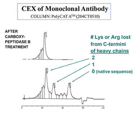 Monoclonal antibodies: The C-terminal residue of the heavy chains is always a Lys- or Arg- residue. Loss of one of these basic residues leads to earlier elution in cation-exchange, while loss of both basic residues leads to an even earlier-eluting peak. The three-peak pattern seen below is characteristic of monoclonal antibodies. The minor peaks are due to deamidation, oxidation, loss of sialic acid residues from carbohydrate side chains, or disulfide bridges with the wrong connections.