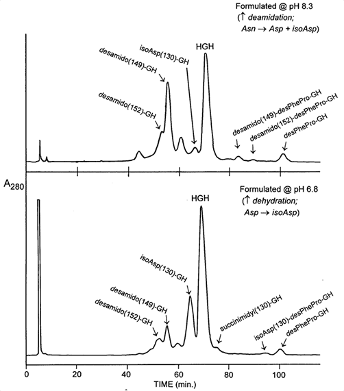 Degradation in storage: At high pH, the most common such reaction is deamidation of asparagine residues to yield a succinimide ring; this hydrolyzes to a racemic mixture of Asp- and isoAsp- residues. At neutral or acidic pH, the fastest reaction is dehydration of aspartic acid residues to yield the same succinimide intermediate and the same hydrolysis products (one of which is identical to the starting material). The effects on biological activity range from negligible to serious. In the past, degradation was assessed by protein digestion and peptide mapping. However, our columns, especially PolyCAT A™, can resolve many intact proteins differing by a single residue. The following figure shows the difference in the degradation pattern of recombinant human growth hormone (HGH) incubated at two different pH’s. The desPhe-Pro variant, a nonenzymatic cleavage product, is well separated from HGH, as are its corresponding variants. Such studiest are critical to determining which pH yields the most stable formulation.
